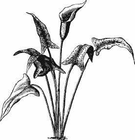 Растение это очень похоже на калля, только листья его совершенно стреловидны и покрыты белыми крапинками и черточками, что придает им очаровательный вид.
