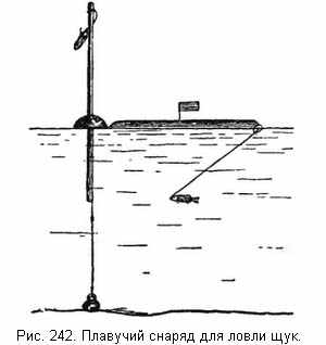 На длинное удилище набивается пробка в ¼ его длины в том расчете, чтобы более длинная верхняя часть несколько перевешивала короткую нижнюю. К тонкому верхнему концу прикрепляется басковый поводок с жерличным крючком, к толстому нижнему - бечева, на которой свободно ездит кольцо груза (железная гиря), служащее для удержания всего снаряда в известном положении. Таким образом, при помощи этих простых приспособлений и лодки можно установить снаряд на любом месте на поверхности, на любой глубине и под любым наклоном к горизонту. Так как поводок короче длинной части удилища, наклоненной к горизонту, то живец не может запутаться. Все движения его будут только поворачивать весьма подвижный снаряд вокруг оси.